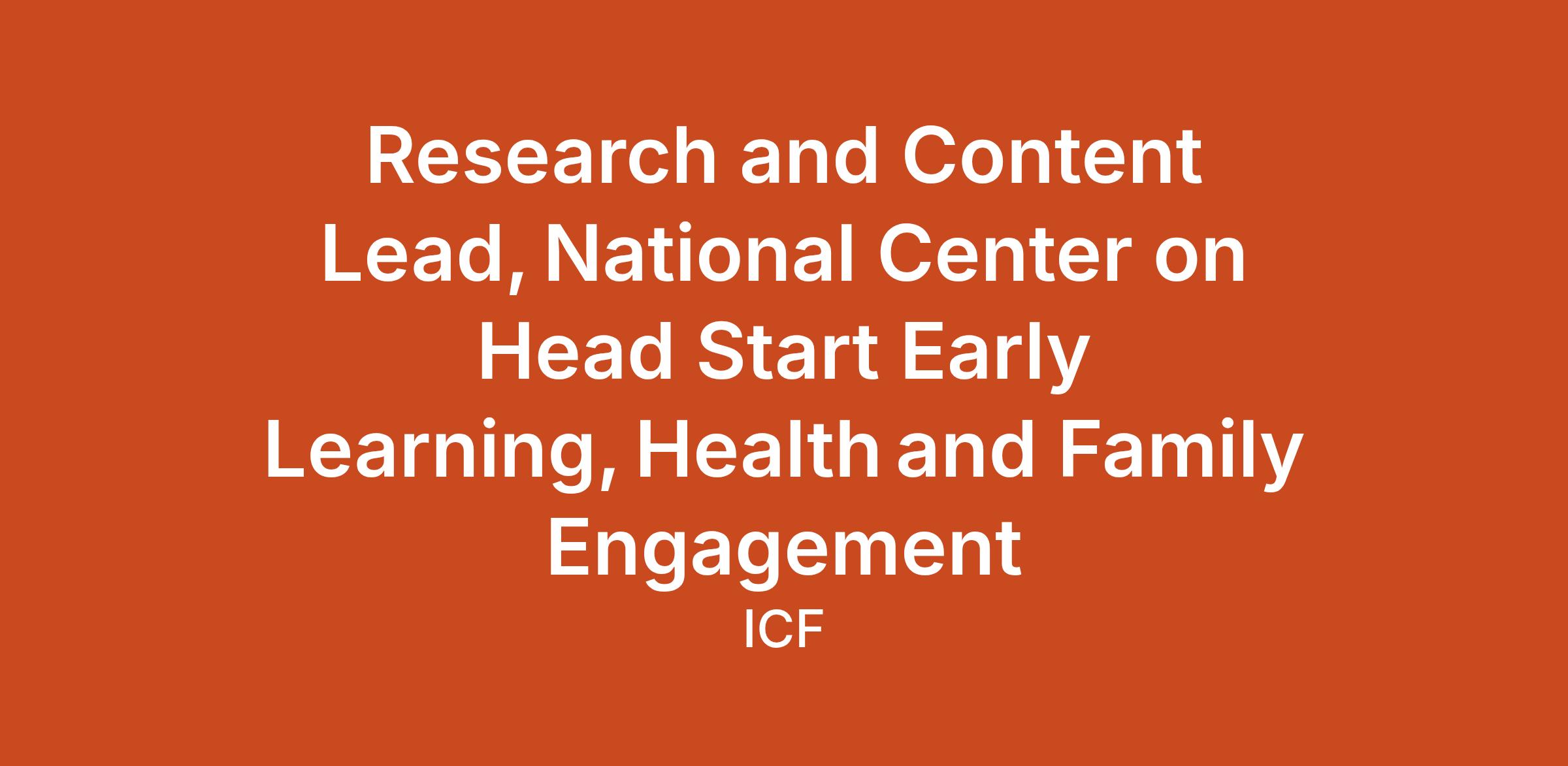ICF is seeking an experienced early childhood professional to serve as Research and Content Lead for the National Center on Head Start Early Learning, Health, and Family Engagement (ELHFE). This position will manage the work of researchers and other collaborators responsible for research and resource development. The Research and Content Lead will ensure that all content produced aligns with the Office of Head Start priorities, is evidence-based, and meets high standards of quality and cultural responsiveness.