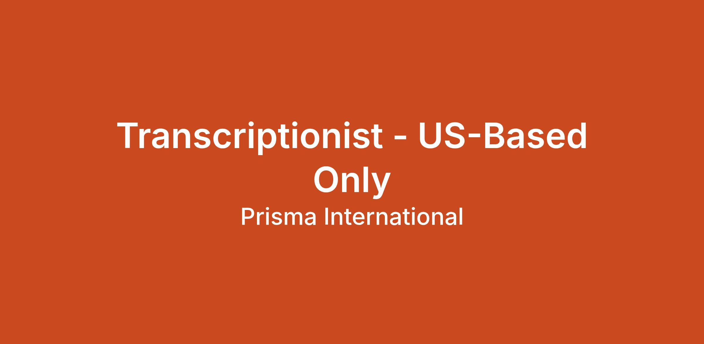 DescriptionAbout Prisma International, Inc. (Prisma) - Prisma is a dynamic and growing language services provider committed to delivering exceptional solutions to clients worldwide. We pride ourselves on our dedication to linguistic excellence and client satisfaction. We are expanding our independent contractor team and seeking experienced US-based Transcriptionists to join us.